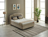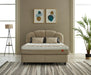 Boxspring rose en tissu au toucher doux et à la texture légèrement chinée, apportant une ambiance élégante et chaleureuse à la chambre.