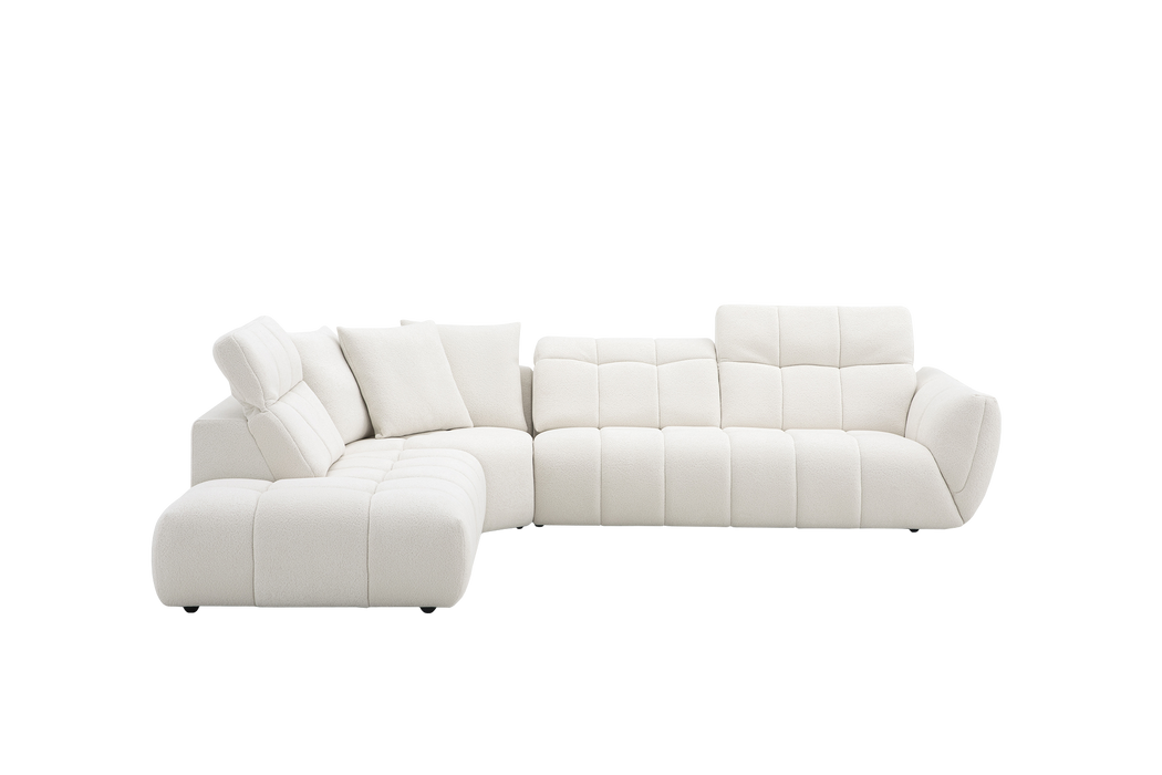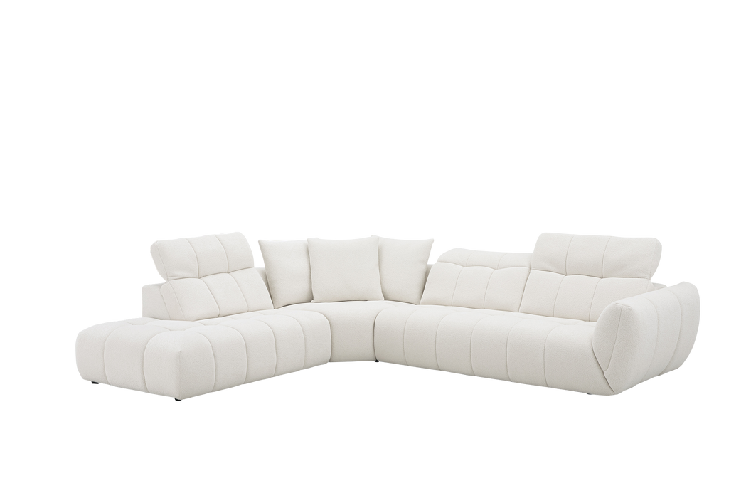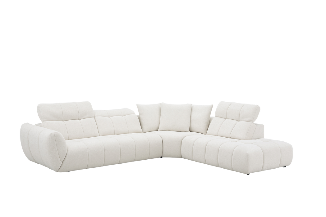 Le salon d'angle 5313 en tissu bouclé beige incarne à la fois élégance et confort. Son design moderne aux lignes arrondies et ses coussins généreux invitent à la détente. Idéal pour un intérieur chaleureux, il apporte une touche cosy et tendance à votre espace de vie.