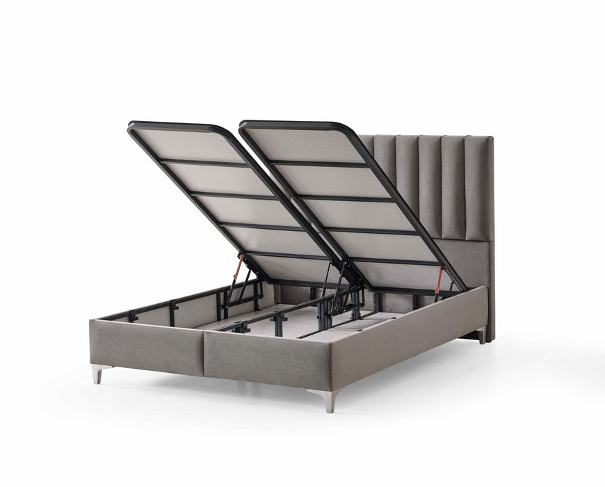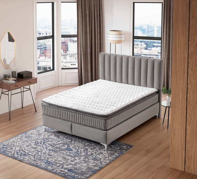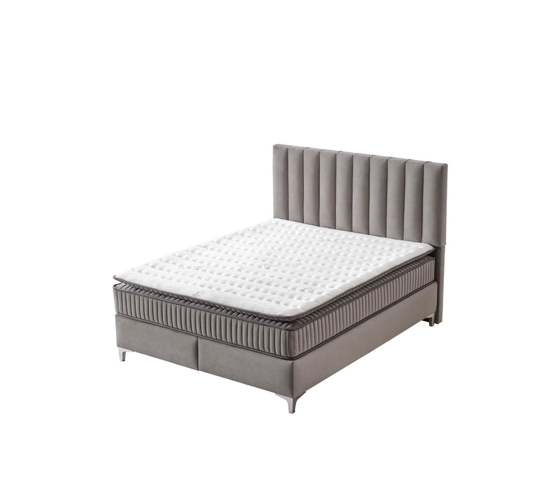Le boxspring Parma, c’est le confort qui charme à chaque fois ! Revêtu d’un tissu élégant, il transforme votre chambre en un espace chic et cosy. Le matelas inclus, accompagné d’un topper moelleux, assure un soutien optimal pour des nuits encore plus reposantes. Le coffre de rangement à ouverture latérale butterfly garde vos affaires bien organisées, tandis que les LED intégrées apportent une touche moderne et raffinée. Choisissez le Parma, et laissez-vous séduire par un style qui charme et enveloppe votre espace de douceur !